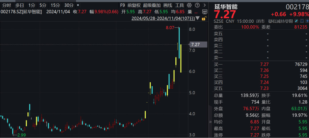 延华智能在上周五走出“天地板”市场后,今天再次以跌停板开盘,但随后直线上涨,仅20分钟左右就走出了“地板”市场。全天成交9.56亿元,换手率19.61%,自“9.24”以来,总共有9度涨停。