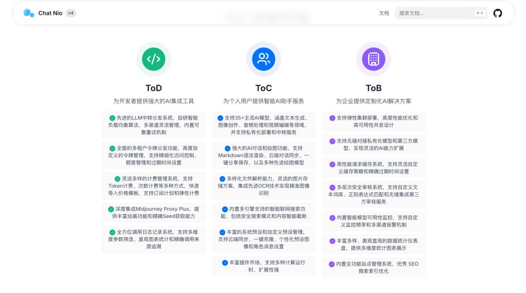 这一系列努力使得 ChatNio 成为了 B 端和 C 端用户的一站式解决方案,既为 C 端用户提供商业化的大语言模型对话系统,也为 B 端(或 D 端)客户提供 OpenAI API 中转服务。
