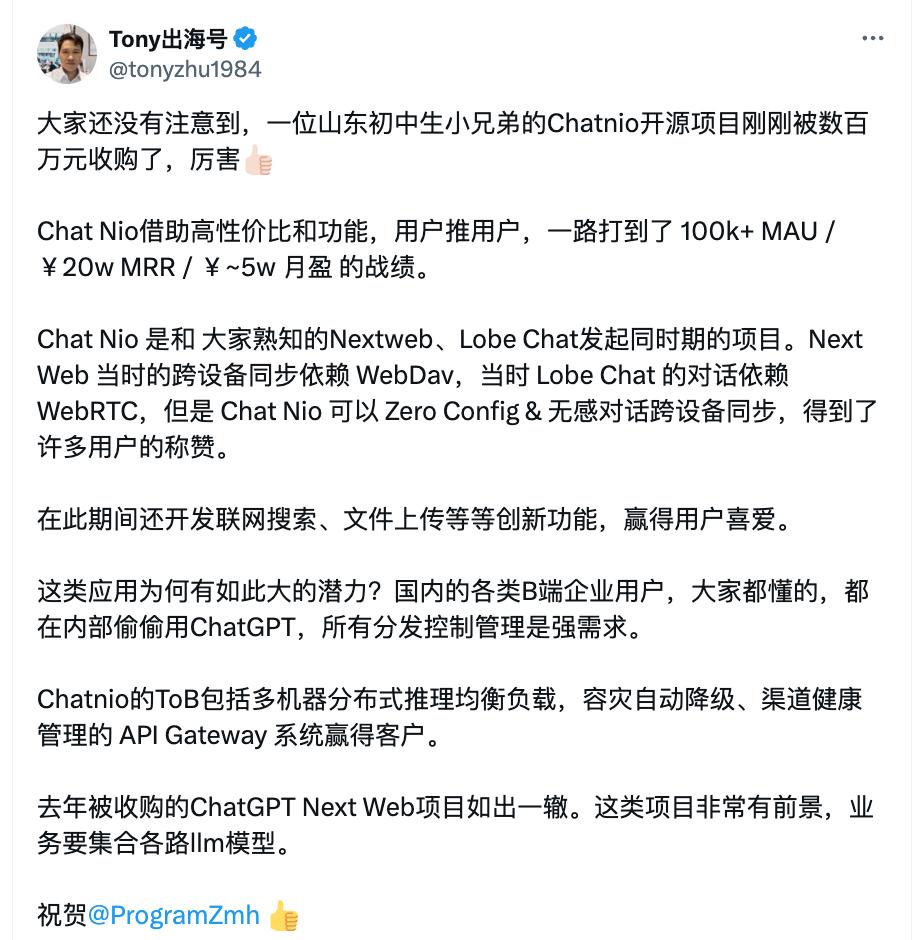 AI 创业者 @tonyzhu1984 也深入分析了 ChatNio 成功的原因,正应了那句:谁满足了用户需求,谁就能在竞争中脱颖而出。