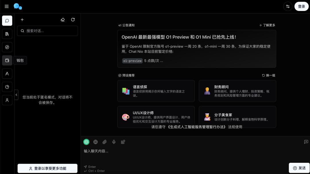 ChatNio 是一个综合了各种流行的模型和服务的一站式平台。它接入了 OpenAI、Midjourney、Claude、讯飞星火、Stable Diffusion、DALL・E、ChatGLM、通义千问、腾讯混元、360 智脑、百川 AI、火山方舟、新必应、Gemini 和 Moonshot 等等模型。