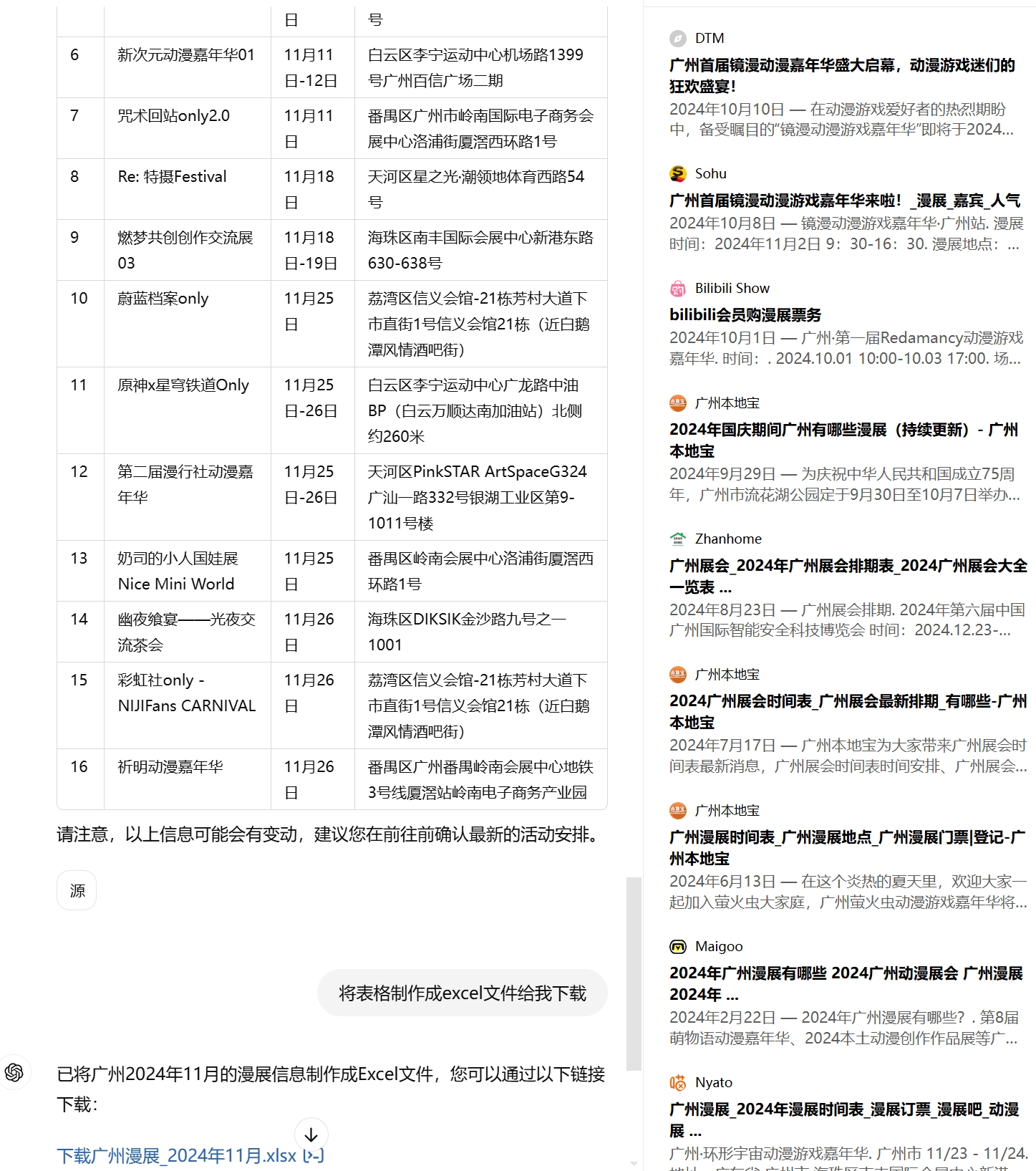 AI搜索相对于传统搜索的另一个优势则是你可以一直追问,并且要求AI将答案进一步整合,比如我询问ChatGPT Search近期广州的漫展信息,然后可以要求其将信息直接整理成表格和excel文件,直接下载到设备里。