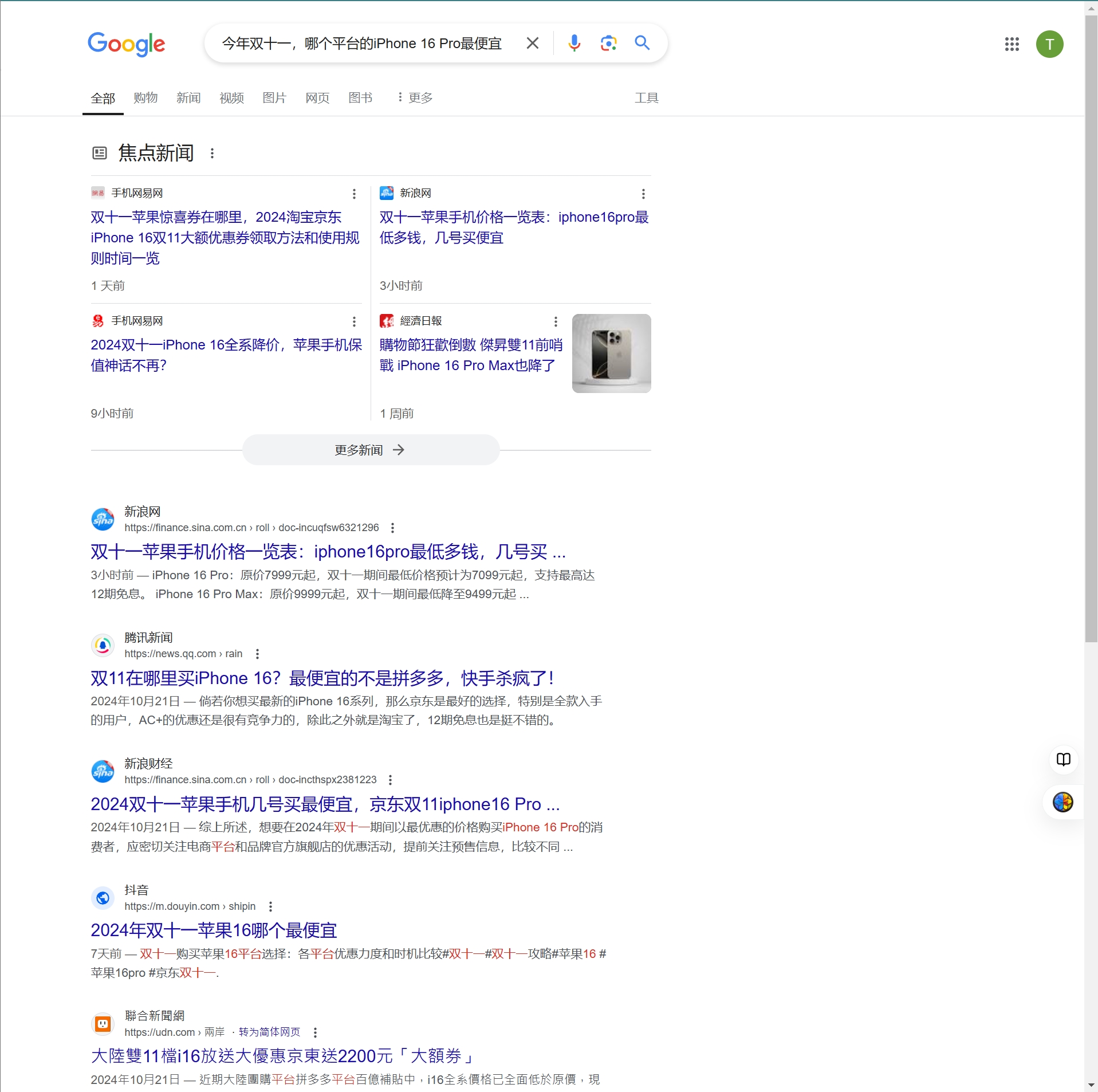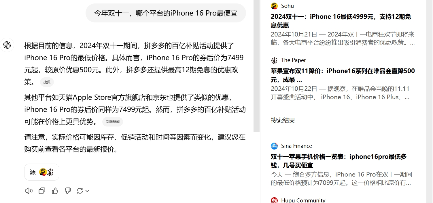 而且你还可以直接提问:“今年双十一,哪个平台的iPhone 16 Pro最便宜”,ChatGPT Search同样会根据时间来汇总答案,并且列出一系列网站,供用户检查回答的正确性或是进一步了解优惠政策。
