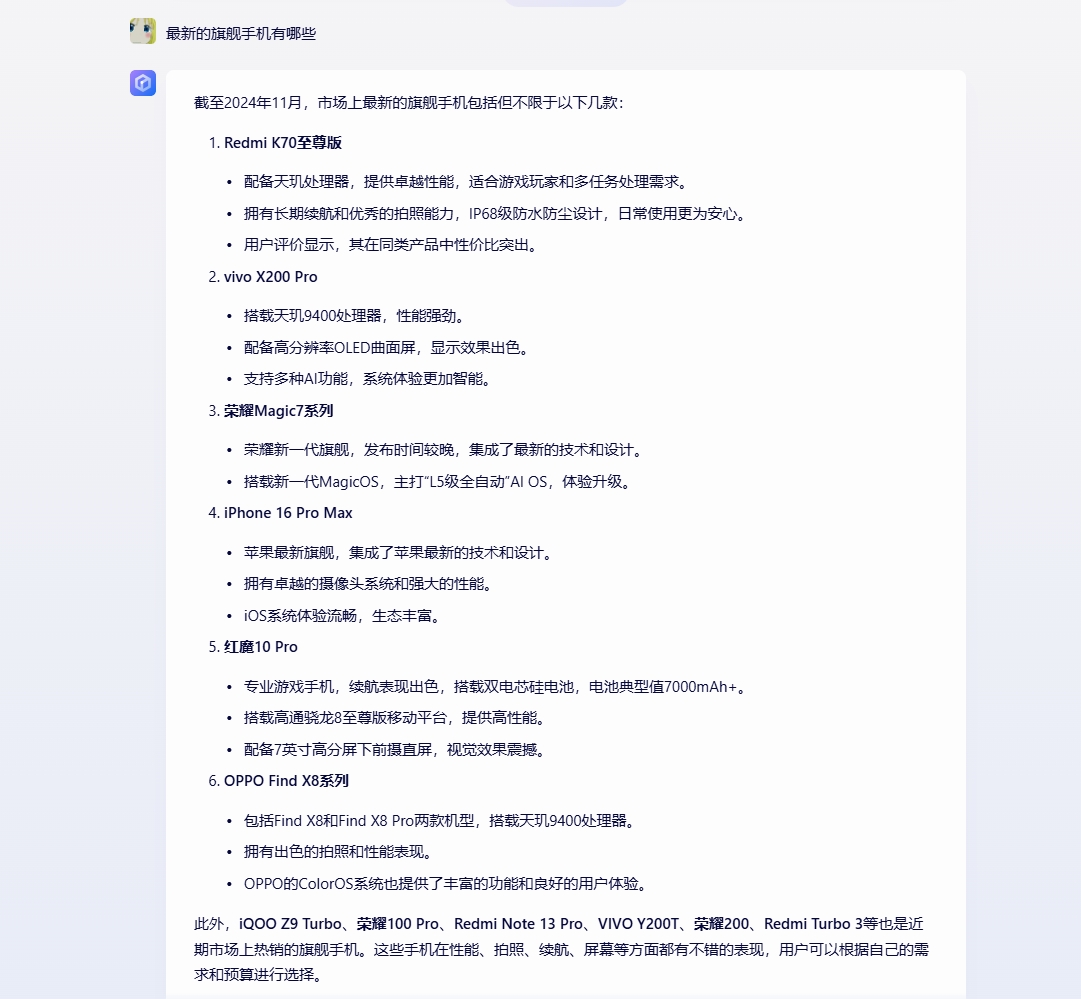 作为对比,百度的AI智能回答也遇到了相同的问题,都把去年的旗舰手机当成了最新的,而且因为缺少追问机制,所以无法进行回答引导。不过在文心一言的网页版里表现则让人满意很多,无需引导即可得到正确答案,即使是免费的3.5版本,其在中文网页搜索方面的能力也并不比ChatGPT Search差。