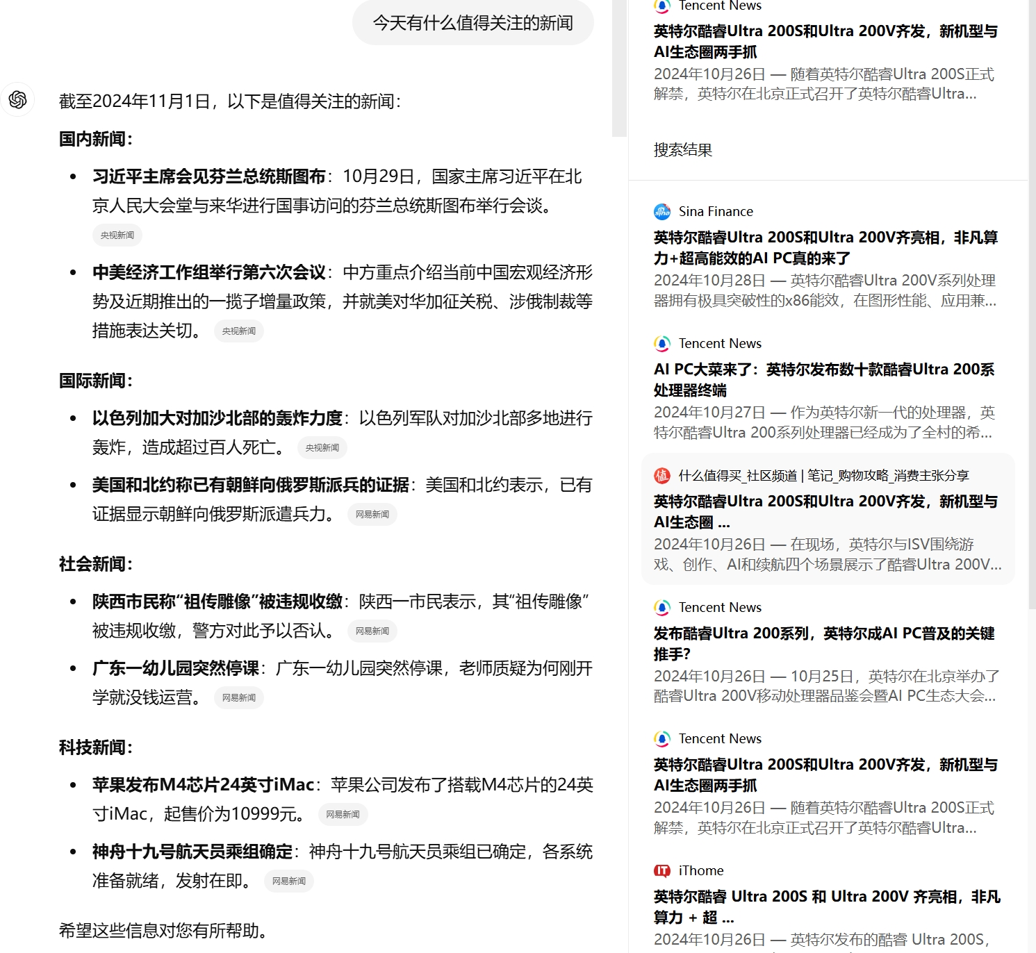 此外, 回答的时间关联性也会有显著的提升,比如我向ChatGPT Search提问:“今天有什么值得关注的新闻”,所提供的答案基本上集中在10月31日(提问时间为11月1日早晨)。