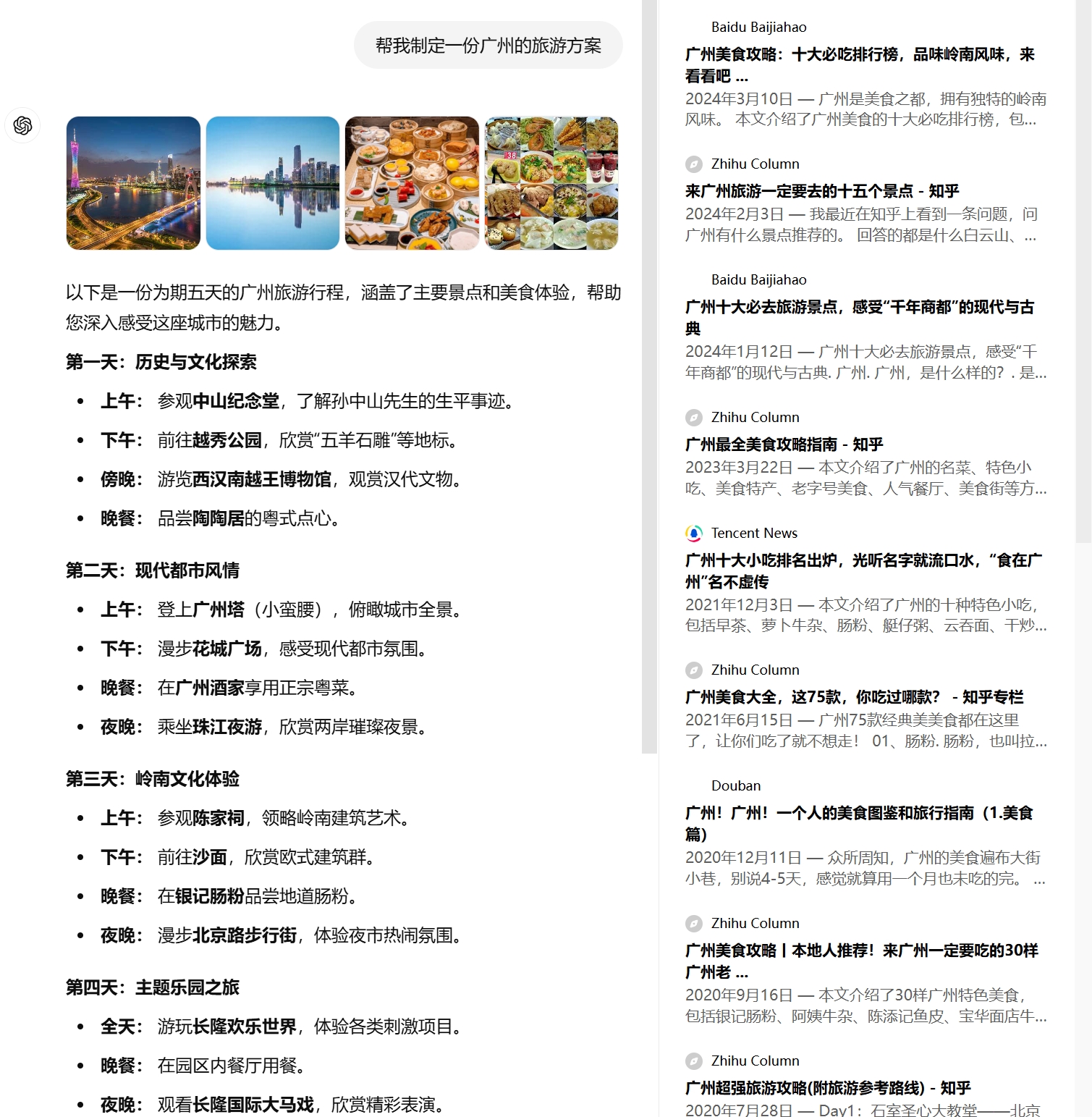 一些用惯了国产AI的朋友或许会问:国产AI在制定旅游计划也可以精准到餐厅,那么ChatGPT Search的区别在哪?区别就在于国产AI针对国内城市是做了对应算法训练的,而后者只是基于中文+城市,直接从网页结果中汇总的结果,这也意味着不管你想问什么,都可以得到类似的精准回复,不需要工程师提前进行优化。
