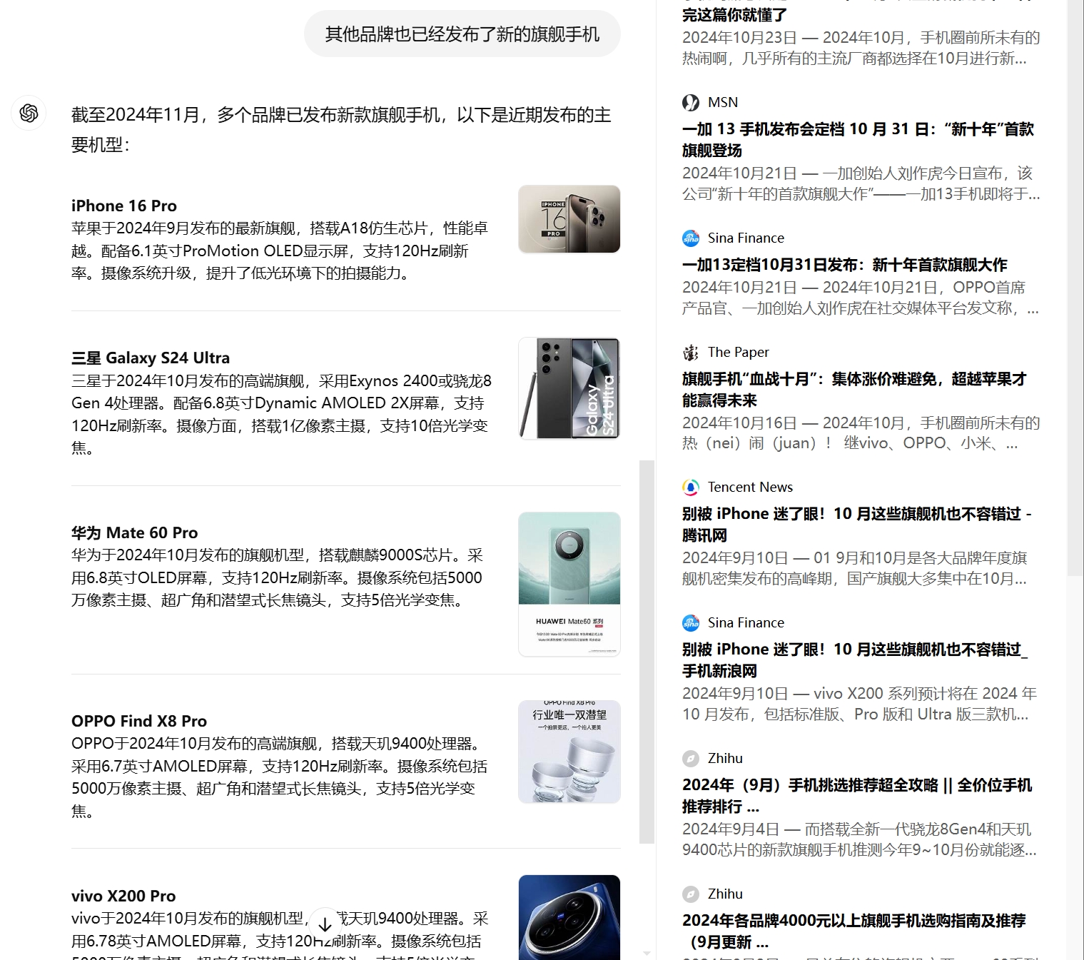 而在同样的问题下,不支持网页搜索模式的GPT-4表现就明显差很多,虽然也检索到了相关信息,但是列出来的确实iPhone 16 Pro Max,而且检索到的信息都较为滞后。