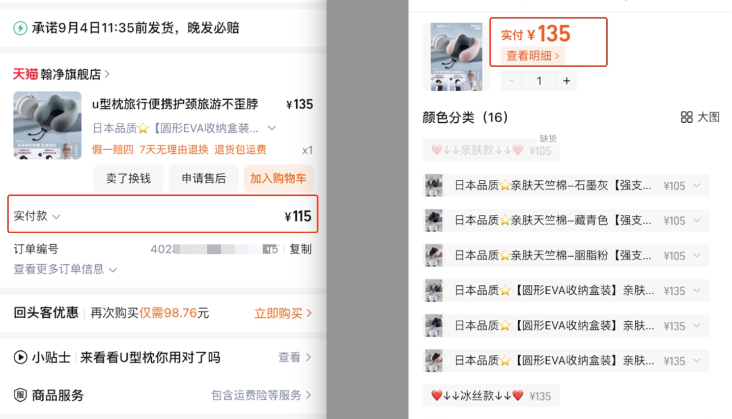 左边是九月份购买订单的价格,右边是双十一的价格。