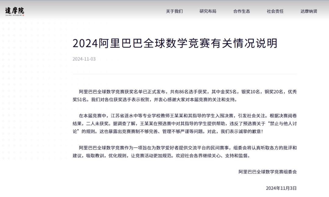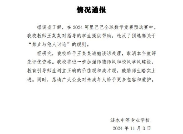同时,江苏省涟水中专学校发布情况报告:调查显示,在2024年阿里巴巴全球数学竞赛预选赛中,我校教师王某某为指导学生提供了协助,违反了资格赛“禁止与他人讨论”的规则。经过研究,我校对王某某进行了劝诫和谈话,并取消了今年评估和评估的资格。