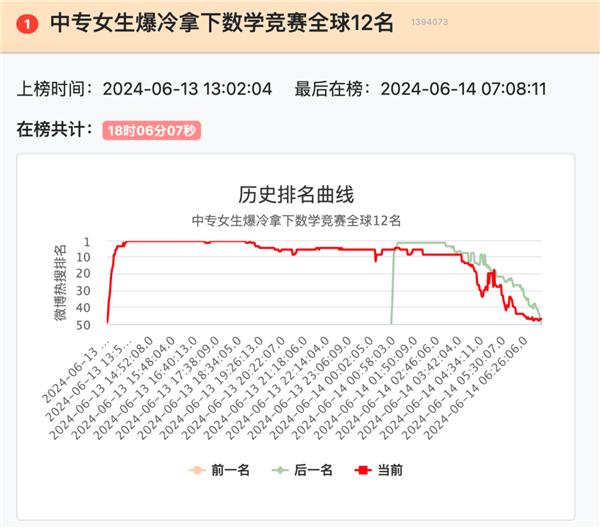 17岁,中专,女生,全球数学竞赛。 12 名字,这些元素很快就让事情登上了各大平台的热搜,从知乎,微博到抖音。当时微博热搜 # 中专女生爆冷拿下全球数学竞赛。 12 名 # 稳坐热搜第一,据不完全统计,光是这个词条的阅读频率就达到了。 2.4 亿。