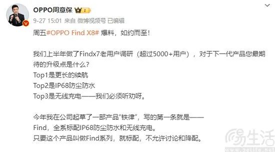 日前,OPPO官方在社交平台上透露,在5000多名Find中, 根据X7用户的调查结果,他们对下一代机型的三个升级点有更高的期望,即长寿命、防尘防水功能和无线充电。与此同时,他还声称,只要Find系列不更名,整个系列将标配IP68防尘防水和无线充电功能。巧合的是,Redmi方面进入前几天也在“Note 在14小金刚回答网友提问时,回答了用户关心的耐久性等问题。