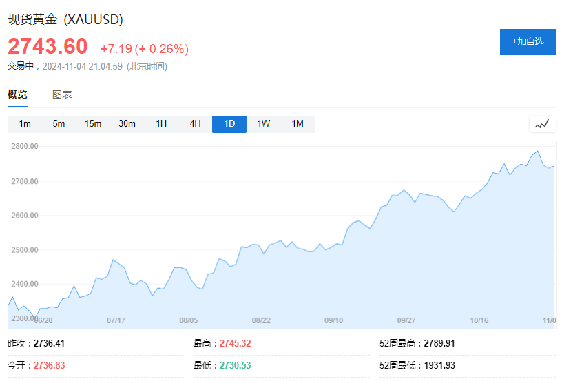 在美国大选的前一周,国际黄金价格在当天创下历史新高,尽管最近两天由于美元上涨而出现回调,但仍处于历史高位。