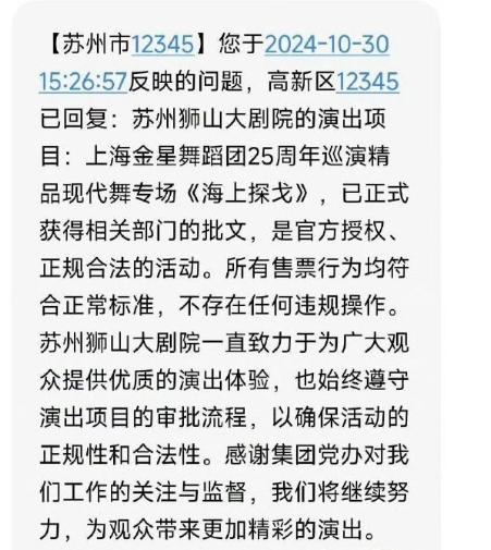 不幸的是,苏州的回复可能会让所有人失望。他们说,金星的表演已经获得了相关批准,这是一项官方授权和正式合法的活动,所有的售票行为都符合正常标准,没有违规行为。