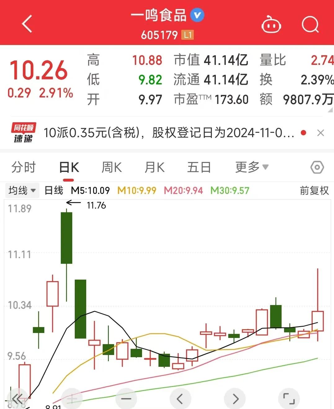 在二级市场,截至11月1日,一鸣食品收盘价上涨2.91%,每股10.26元,总市值41.14亿元。