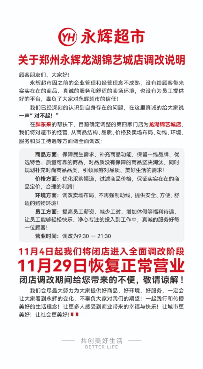 据永辉超市河南有限公司消息,在胖东来的帮助下,郑州龙湖锦艺城店确定调整第四家门店。11月4日起,正式关闭门店,进入全面调整,11月29日恢复正常营业。
