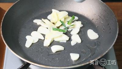4. 锅内留下的底油,加入大蒜、姜片、大葱、花椒文火炒香,再加入少许鱼露,生抽和花椒油炒匀即为料汁。