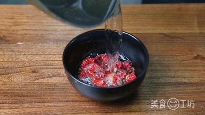 3. 锅里滚油(3 加热),倒入碗中配有干辣椒和花椒,制成糊辣油。