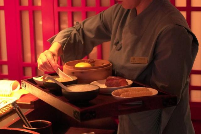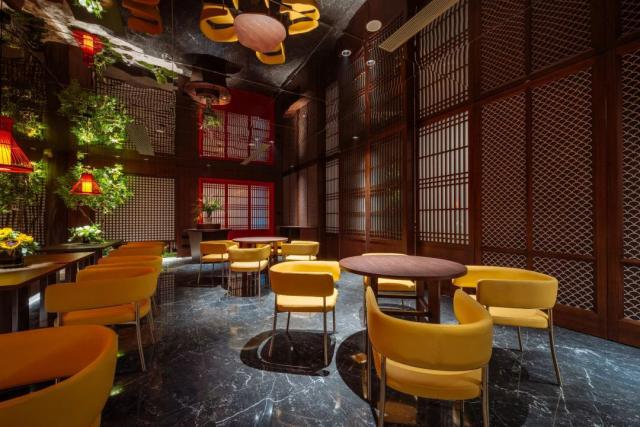 而且空间的艺术性更多的是靠许多细节来打磨,特别是对于在地文化演绎中的小场景制作,点点滴滴都是巧妙的。例如,花筑奢 · 竹香居的佛光走廊提供了一种不寻常的到达方式,以锦鲤鱼池的侧景为主题,穿过瀑布,穿过弧形大门,进入这条醉人的走廊;走廊由手工红铜组成,铺有红铜大理石地板;在走廊的尽头,顾客会发现一尊明代观音佛像,由绿铜制成,在设计上吸收了卢浮宫尼禄雕像底座船头的灵感,加入了亚洲元素。