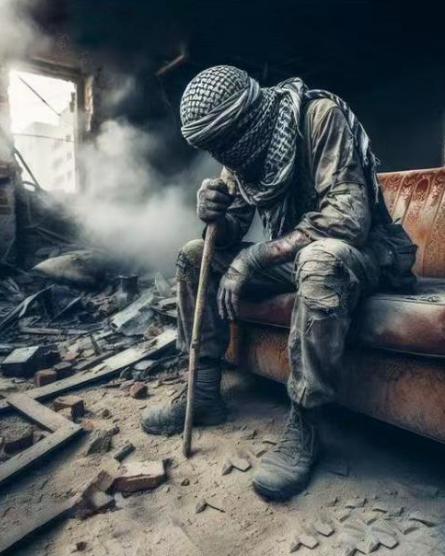 一个来自难民营的游击战士,入狱几十年,白发苍苍,穿着军装,手里拿着武器,倒在一片废墟里,倒在战友身边,倒在祖国的土地上,断了双腿,断了一只手,用铁丝绑住伤口,用木棍做最后一击...