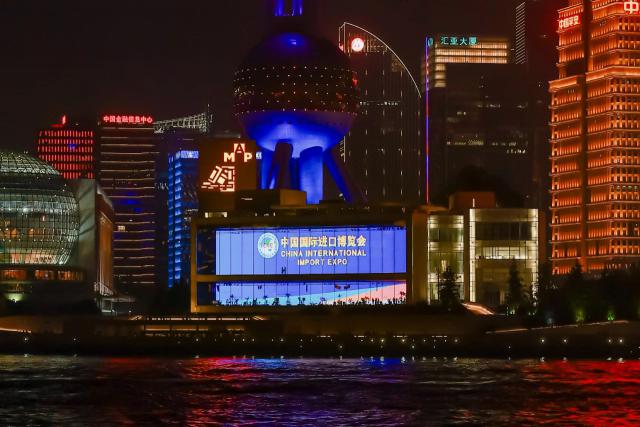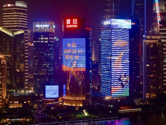 迎接中国国际进口博览会,申城五彩缤纷的夜景再升级。