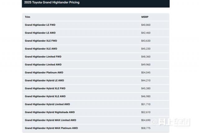 目前丰田 2025 款 Grand Highlander 该车型已在海外市场上市销售,新车也可视为“大汉兰达车型”,并在系列车型中得到加强。 LE FWD 入门级前驱车型供消费者选购,市场起售价下降至 40,860 美金(约为 30 万元)。据报道,新车预计今年最快将于今年。 12 月亮陆续开启了新车交付工作, LE 入门级车型将于明年上半年陆续完成交货工作。