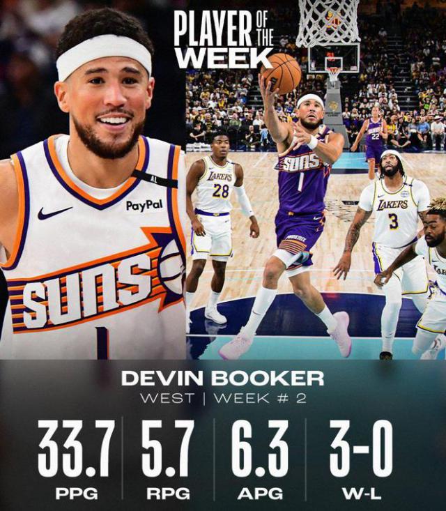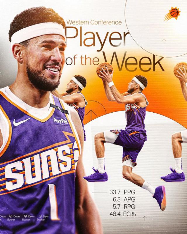 上个星期,太阳得到了 3 胜 0 负面记录,场均布克 33.7 分 5.7 篮板 6.3 助攻 1.3 断球,投篮命中率 三分命中率48.4% 37%。太阳官方晒图祝贺布克获奖。