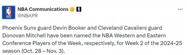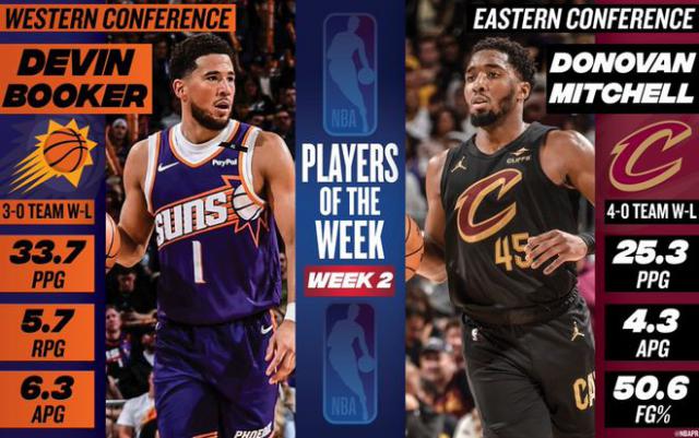 NBA官方宣布周最佳:布克场均轰33.7分。 米切尔带领球队取得了全胜