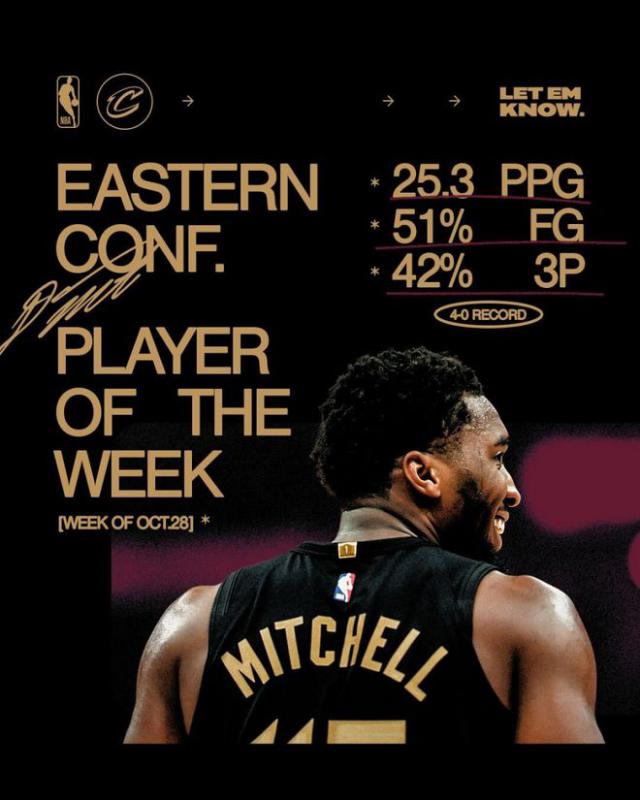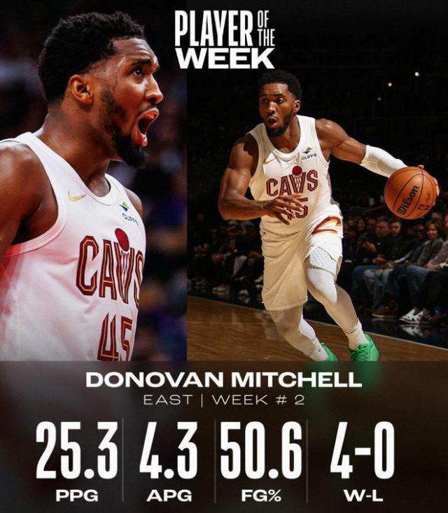骑士上个星期得到了 4 胜 0 负面记录,米切尔平均场均 25.3 分 2.8 篮板 4.3 助攻,投篮命中率 三分命中率50.6% 41.9%的骑士官方晒图祝贺米切尔获奖。