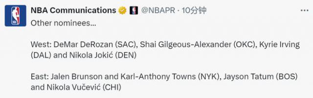 西部:德罗赞(国王)、亚历山大(雷霆)、欧文(独行侠)、约基奇(掘金)。