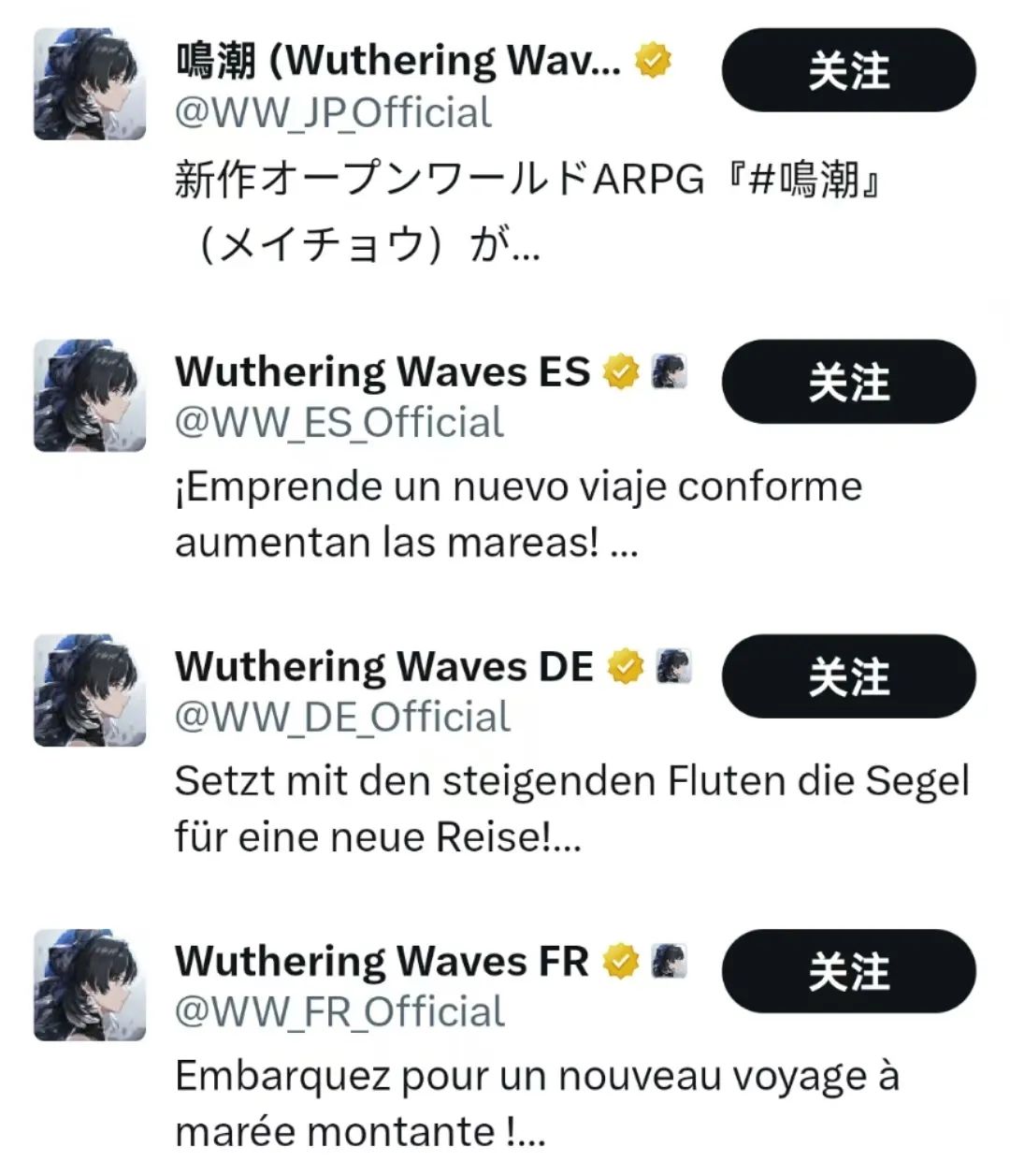 正是这样,你会看到近年来,国内大厂不断向新加坡、加拿大等海外地区建立团队收缩人才,越来越多的商品同时在全球许多国家上线或同时运营。比如灵犀最近出海的《救世者之树:新世界(森之国)》,首次选择了日本、韩国、繁华、中国的多个版本,当天开通了服务;库洛的《鸣潮》早在预热阶段就专门开通了德国、法国、西方等欧美语种的官方账号,以尽可能辐射给有机会接触商品的海外受众。