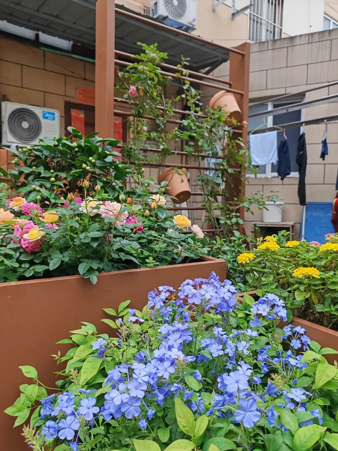 从伊犁路134号西门进入,伊享空间共享花园映入眼帘。月季花、茶花、杜鹃花等10多种花卉种植在高低错落的花箱里,黄色、紫色、粉色、红色...五颜六色,就像“莫奈花园”一样,吸引居民驻足观看。