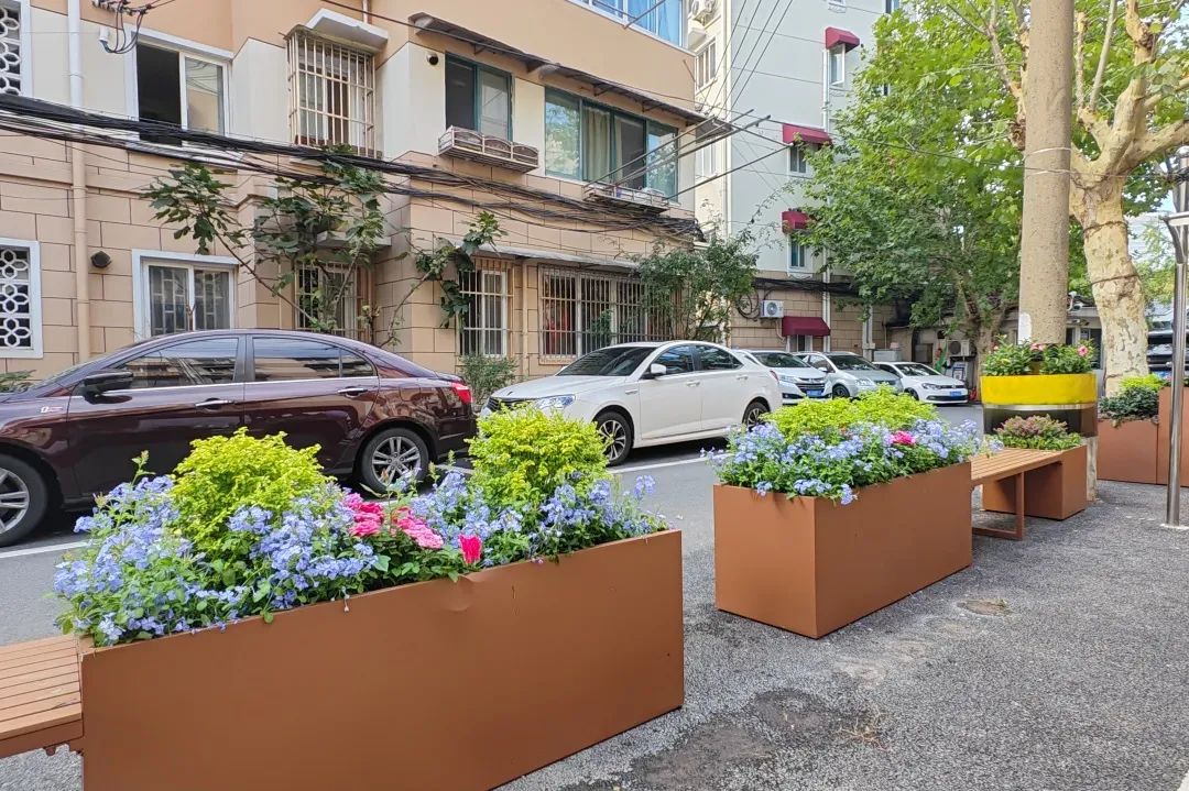 “跳房子”游戏涂鸦在地上,连路过的阿姨都忍不住跳来跳去,享受童年的乐趣。休闲座椅要么嵌在花箱和花箱之间,要么从花箱的一侧延伸出来,营造出相对封闭的空间,既避免了乱停车,又让老人和孩子安全休息玩耍。