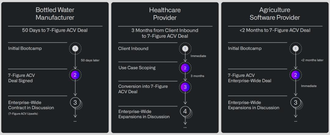 虽然参与Bootcamp的企业客户并不一定真正成为Palantir的用户,但AIP采用Bootcamp策略,在一定程度上填补了Palantir的规模劣势,成功地缩短了整体客户转换时间(缩短到1-3个月)。