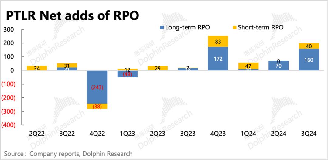 第三季度,Palantir的剩余合同金额为15.7亿美元,同比增长2亿美元。和第二季度一样,第三季度的长期合同净增长也比较大,这才是真正体现增长的区域。(短期合同的增加可能来自长期合同期满转短期合同,而不是外界真正带来的需求。)