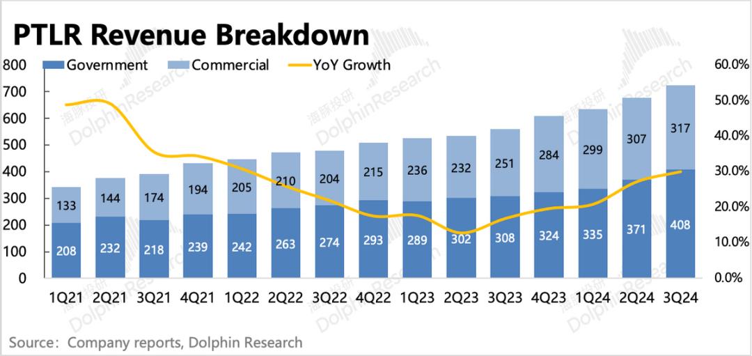 同时,美国政府的收入占政府总收入的75%(2Q24),占总收入的41%。这就是说,无论Palantir的AI商业梦想有多大,美国国防部对Palantir在支撑增长方面的重要性至少在当前和可预见的短期内。