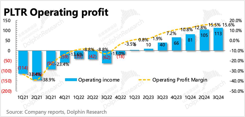 第三季度,Palantir处于扭亏增盈的红利期结束,营业利润增长至1.13亿元,同比增长183%,增速明显放缓。