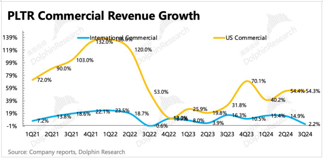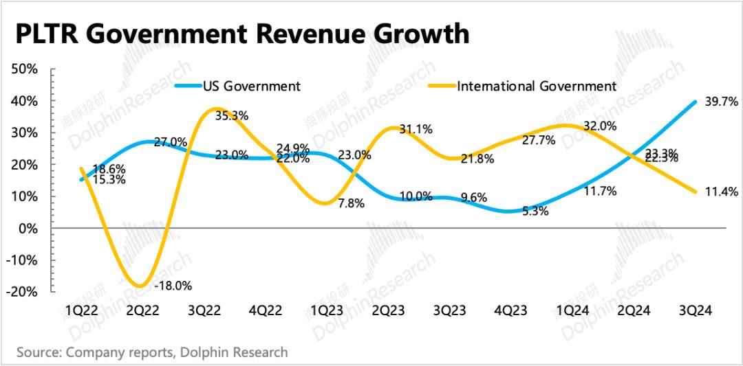 相反,国际市场的增长速度明显放缓,尤其是海豚君一直提到的。政府收入涉敏的相关信息。虽然国际企业客户没有政府那么敏感,但他们可能会有所防范,尤其是在欧洲,他们非常关注数据安全保护,因为他们需要在Palantir方案定制过程中为企业提供大量的内部业务数据。