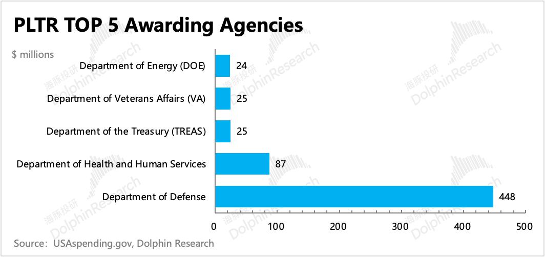 截至11月3日(美东时间),第四季度确认的新履约合同规模已超过第三季度的一半,这在一定程度上反映了Palantir在政府端收入增长的可持续性。从目前的合同规模和授予机构的分布来看,国防部是美国政府订单中总金额最大的机构,直接占了约90%的份额。
