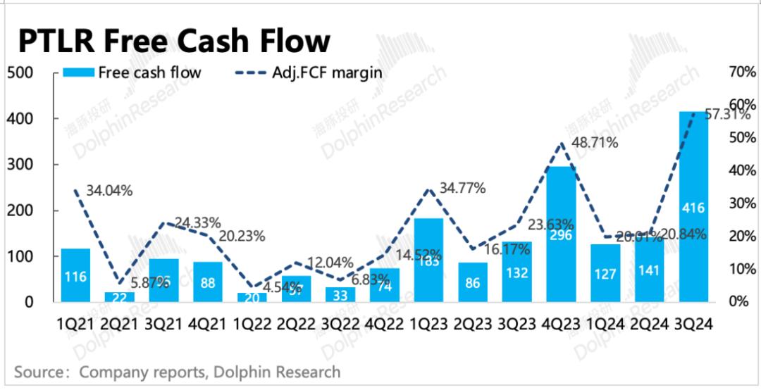 利润增长主要来自于收益变现的扩张,成本已经过了提升周期,开始重新扩张。这个季度毛利率环比下降了1.2pct,AI变革的一些新投资在一定程度上得到了体现。然而,由于Palantir的原始产品本身也涉及到AI的基本技术,而Palantir并没有卷入通用大型模型,相当于大多数投资都是外部的。所以与往年相比,近一年的资本支出并不高,这意味着后续对毛利率和R&D支出的增长压力相对可控。在利润爆棚的情况下,这也带来了自由现金流,不受Capex的影响,也迅速上升。