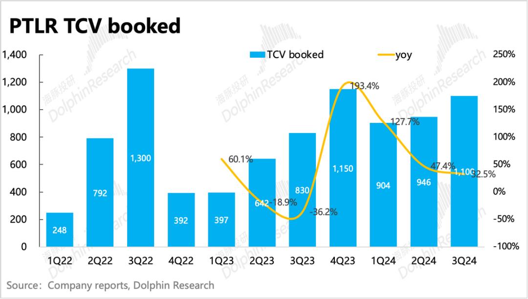 (1)前三者涉及到合作周期问题,对中长期增长前景更有帮助:第三季度,RPO继续加速增长,TCV增速放缓。与去年第三季度AIP大力推广和数量增加有关。但前者包括未开票的合同金额,其中长期合同增幅较大,有望支撑Palantir的中长期增长。