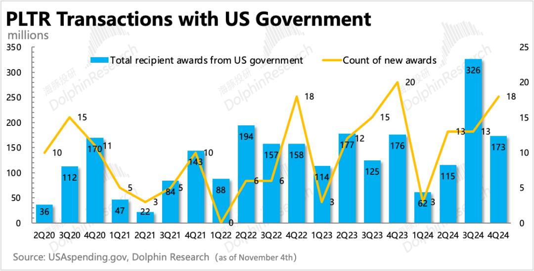 海豚君上两季度提到的两份大额合同(陆军2年签订1.78亿美元的合同;国防部和AI办公室的初始订单为1.53亿美元,未来可增加5年至4.8亿美元的合同),并从第三季度开始确定计入履行周期。