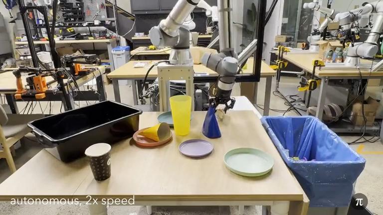 Physical Intelligence 发布的视频显示,他们的机器人可以非常灵巧地完成各种家务,包括但不限于:桌面上摆满了水杯和盘子: