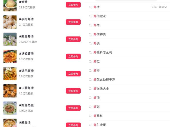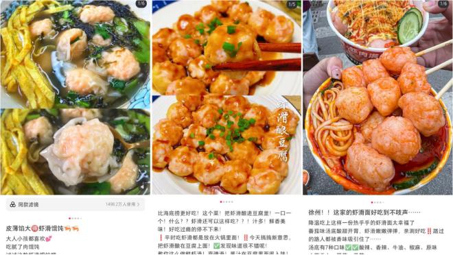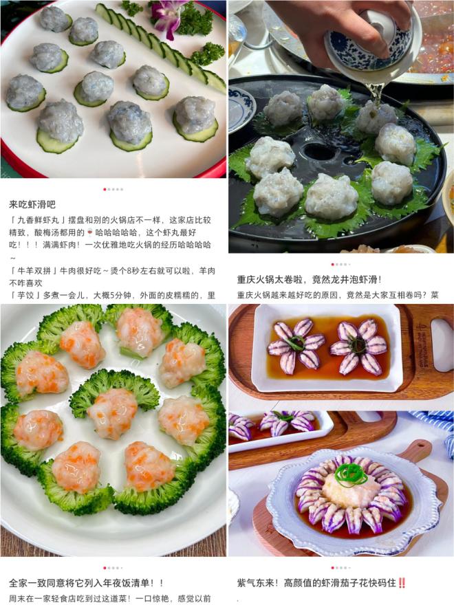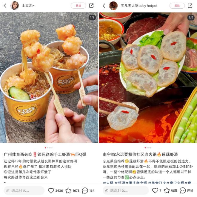人气高,容易爆款。如上所述,虾滑是一个非常受欢迎的品类。在抖音中,虾滑相关话题的播放量接近 30 亿;而且在小红书里,关于虾滑的种草笔记更多 94 万多篇。