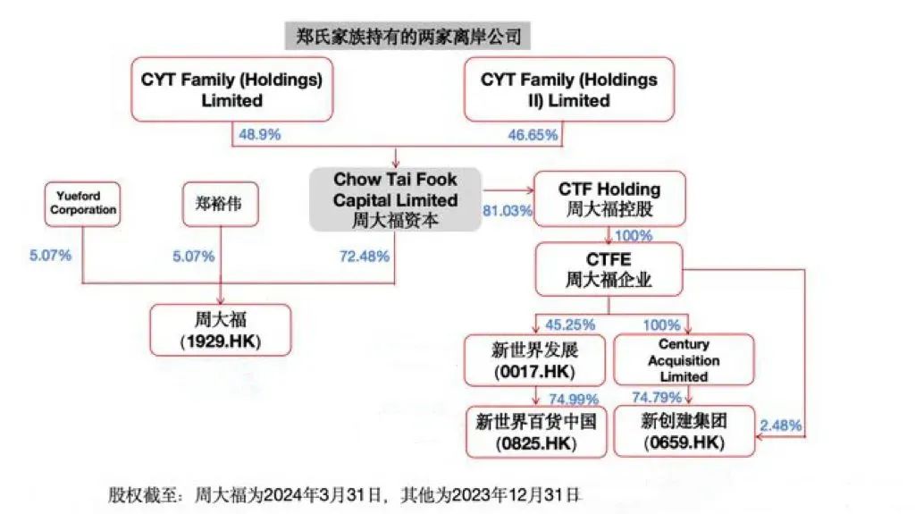据公开资料显示,郑氏家族的两大离岸家族信托企业Cheng Yu Tung Family(Holdings)Limited和Cheng Yu Tung Family(Holdings II)Limited,周大福控股通过共同控股拥有家族企业。郑裕彤家族通过将家族企业股份纳入离岸家族信托,提前规划资产分配,避免了家族内耗,凝聚了家族成员的凝聚力。