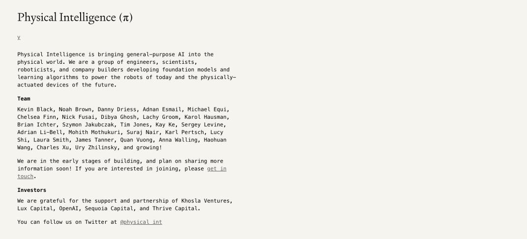 这一轮融资之后,Physical Intelligence的估值大约是 24亿美金 ,与3月份种子轮阶段的4亿估值相比,其估值在短短半年内上升。 6倍 。