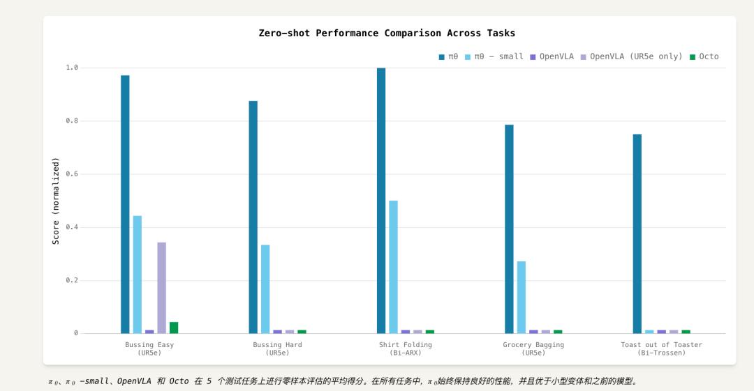 据介绍,Physical Intelligence提到,自己的pi-zero模型在大多数复杂任务中的表现都比OpenVLA和Octo要好。