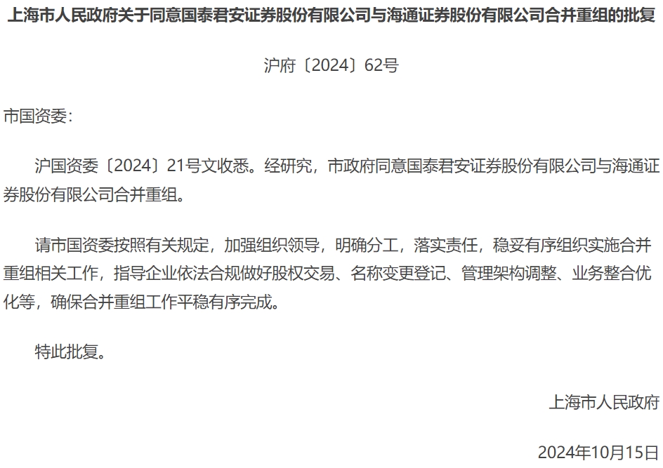 11月5日,上海市人民政府发布《上海市人民政府关于同意国泰君安证券有限公司与海通证券有限公司合并重组的批复》(以下简称《批复》),同意国泰君安证券有限公司(以下简称“国泰君安”,601211.SH,02611.HK)与海通证券有限公司(以下简称“海通证券”),600837.SH、06837.HK)合并重组。