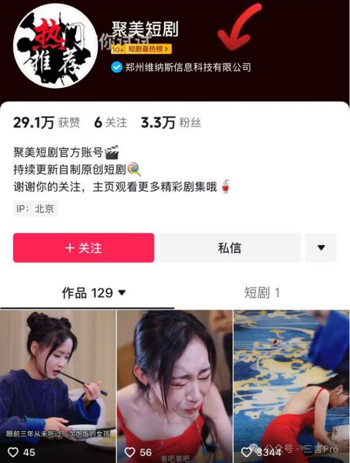 然而,这些作品大多只有几十或几百个赞数,最受欢迎的是12000个赞数。目前这个账号只有33000粉丝,累计赞数只有29.1万。从这个角度来看, 陈欧的短剧生意,做得并不好。