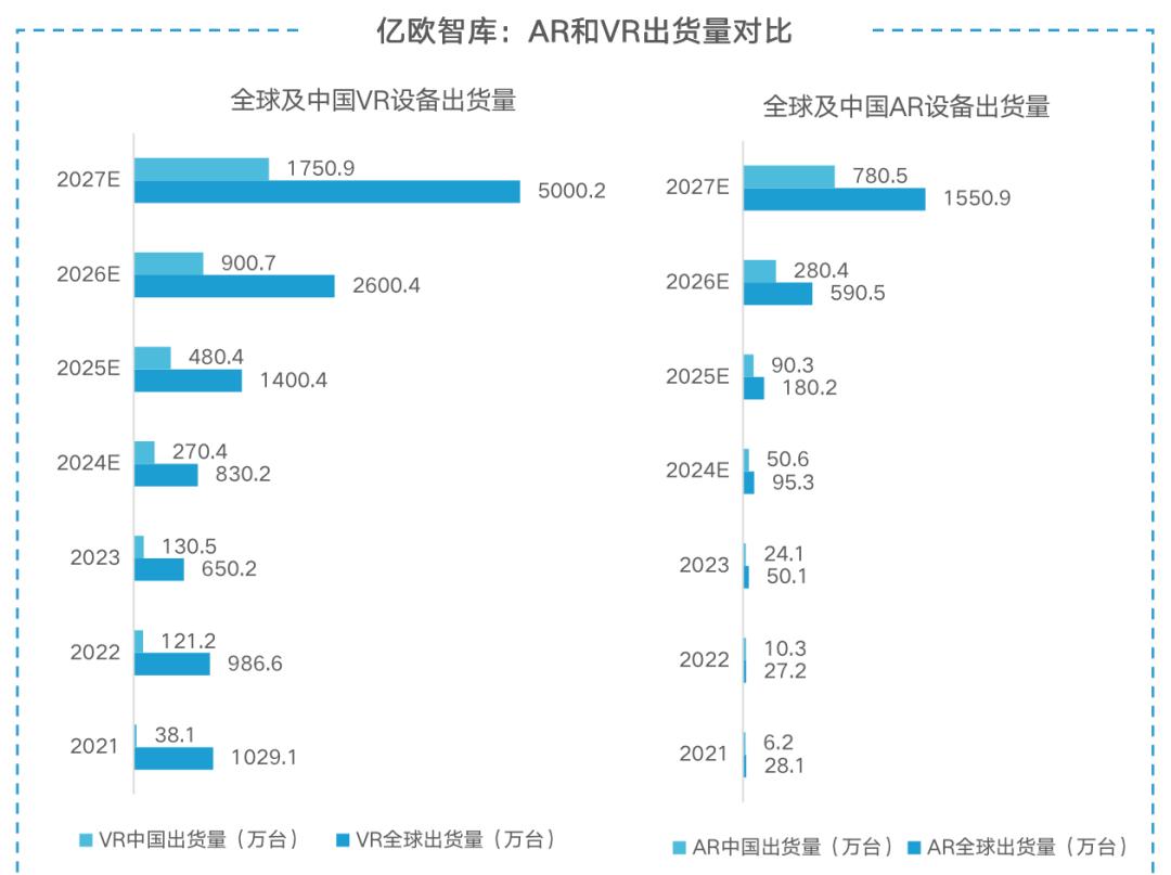 数据显示,2023年全球AR设备出货量同比增长84.19%,中国出货量占48.1%。而对2024年来说,市场对AR给出的预期将会更高,全球出货量将达到95.3万台,中国出货量将占50.6万台。