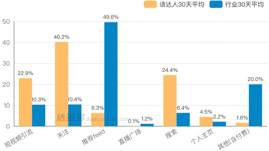 第三方平台达多多显示,最近一个月听泉鉴宝和潘宏的直播间流量,有一半以上来自Tiktok的“推荐feed”流量,即主播并没有在直播上花钱,而是依靠平台为用户定制的内容推荐流,即Tiktok通过算法向用户推荐的内容流,根据用户的兴趣、行为和喜好。