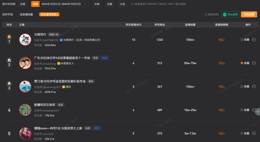 10月21日至27日期间,新抖数据显示,前五名抖音主播分别是与辉同行、广东夫妻、贾乃亮、新疆和田玉老郑和懒猫nonon,前三名是大促销期间稳居前排的常客,第四名和第五名是个人风格明显的C端商家,粉丝数量在一两百万之间,与前三名的千万粉丝数量有着悬崖般的差距。